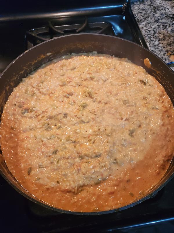 Then pour in the half half. In the same skillet add the heavy cream and white rice. I didnt have cream of chicken so I used cream of mushroom and I didnt have velvetta or enough cheddar cheese so I used whatever cheddar cheese I had left 12 cup maybe and then used shredded.